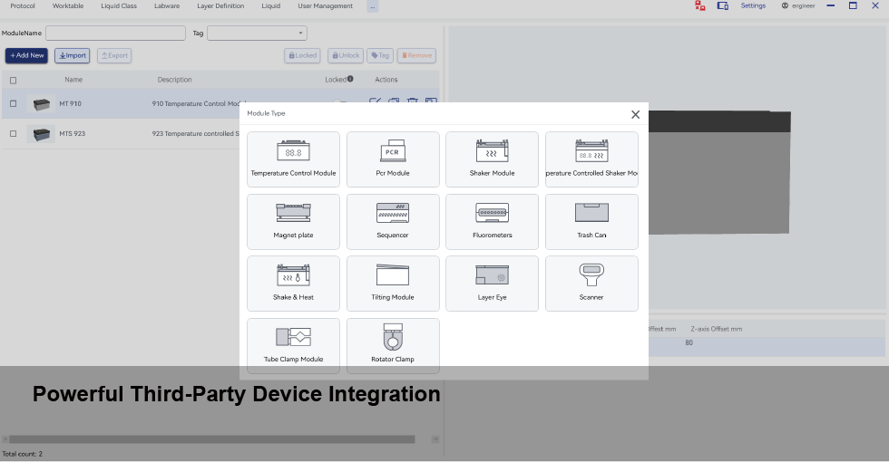 • Extended Capability: Support seamless synergy between the fixed 96-channel pipetting module and an integrated adaptive force gripper module